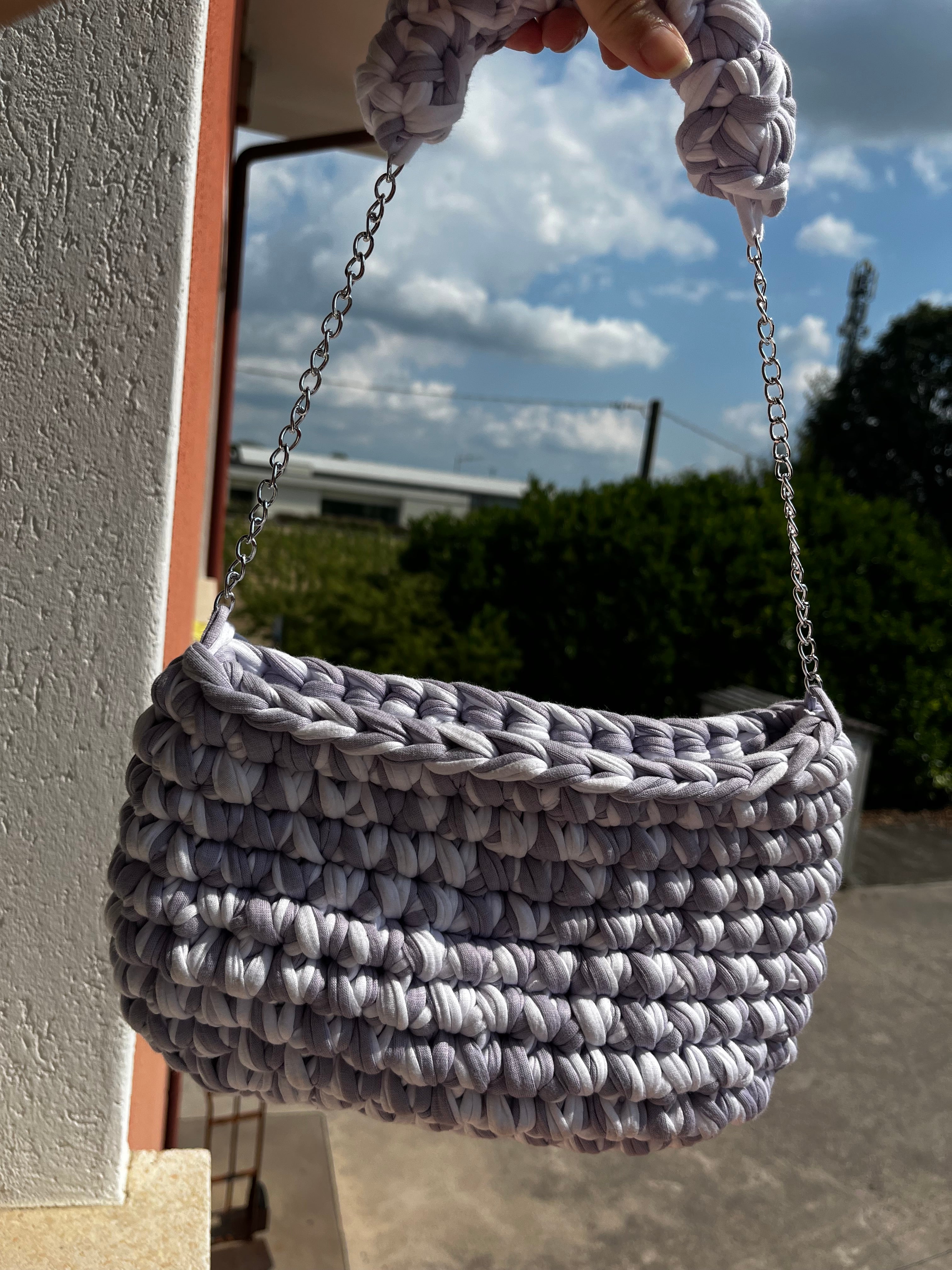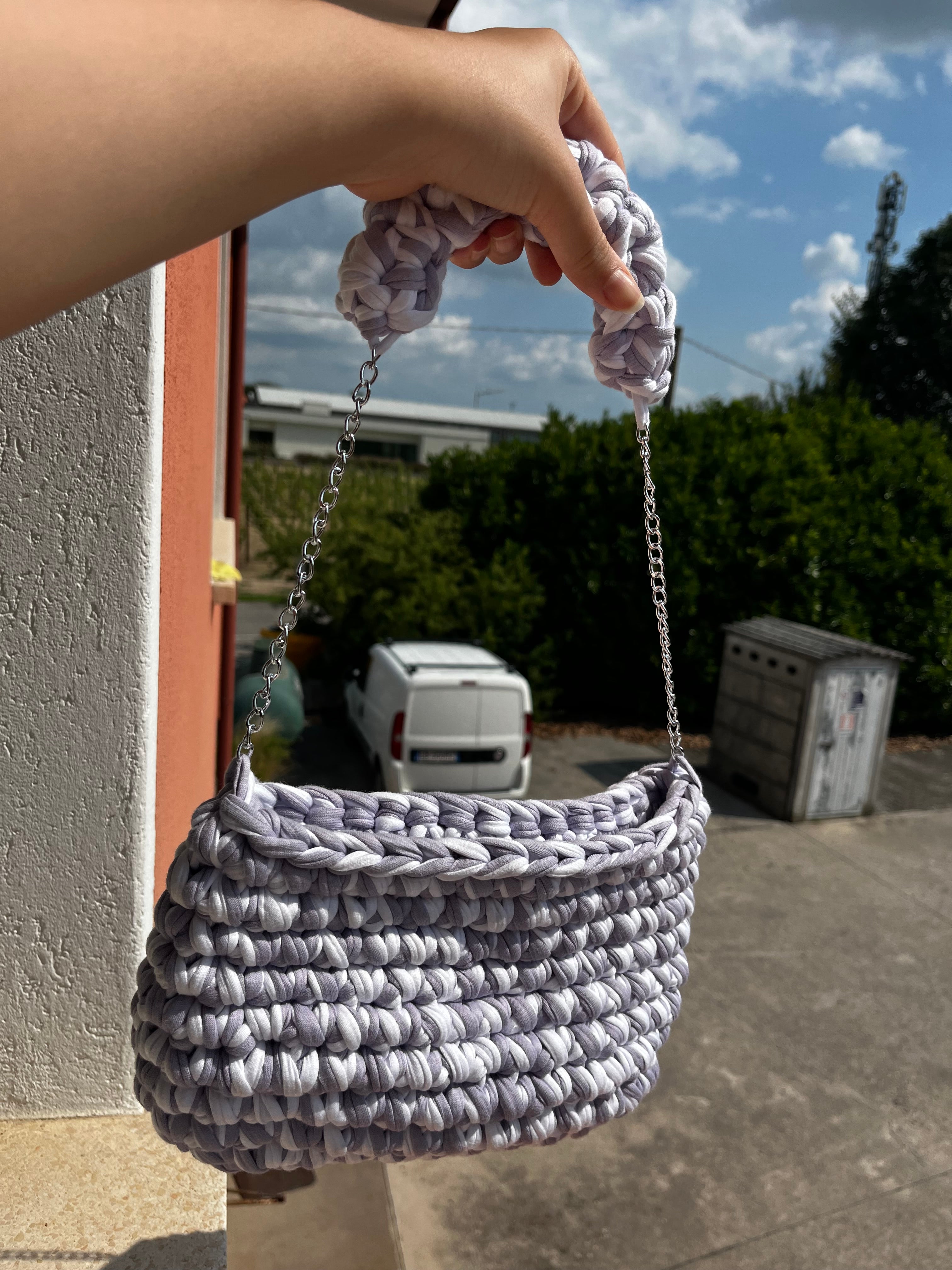 Un accessorio unico che unisce artigianato e modernità, Fusion Tote realizzato interamente a mano all'uncinetto con una morbida fettuccia in cotone o lycra e catena in metallo color argento, è un accessorio compatto ma capiente, pensato per accompagnarti con stile in ogni occasione.