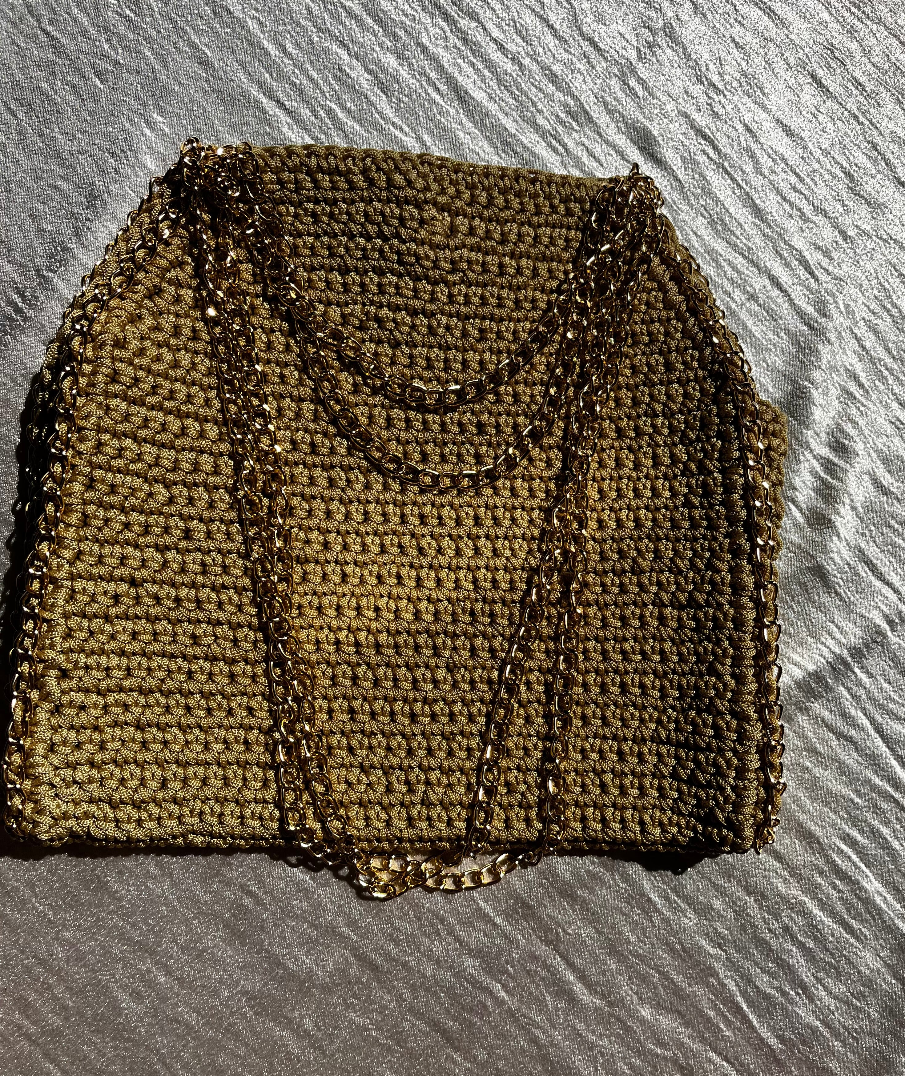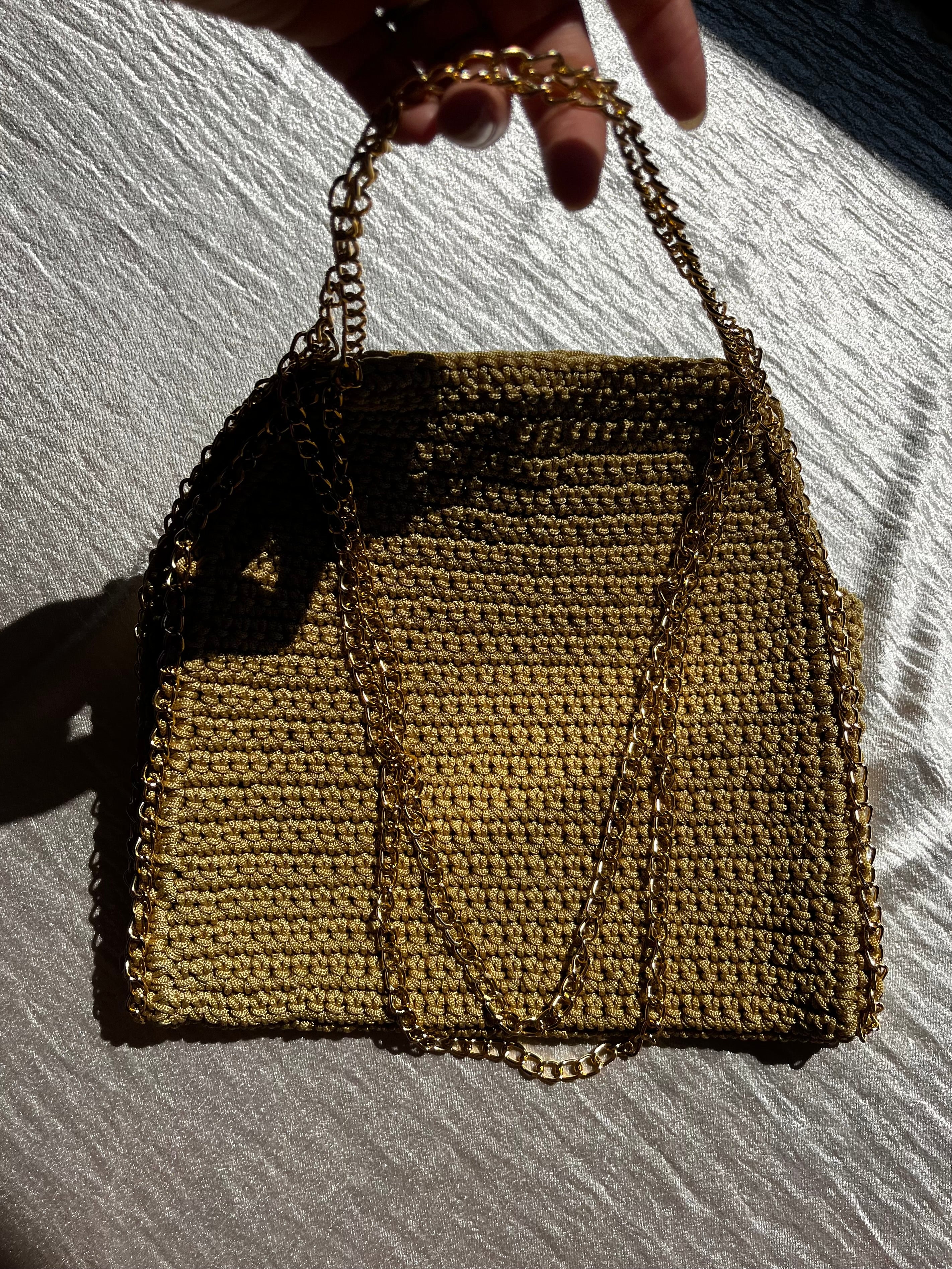 Questa borsa all'uncinetto, realizzata interamente a mano, prende ispirazione dal modello Falabella, reinterpretato con la cura e l'autenticità del fatto a mano.
