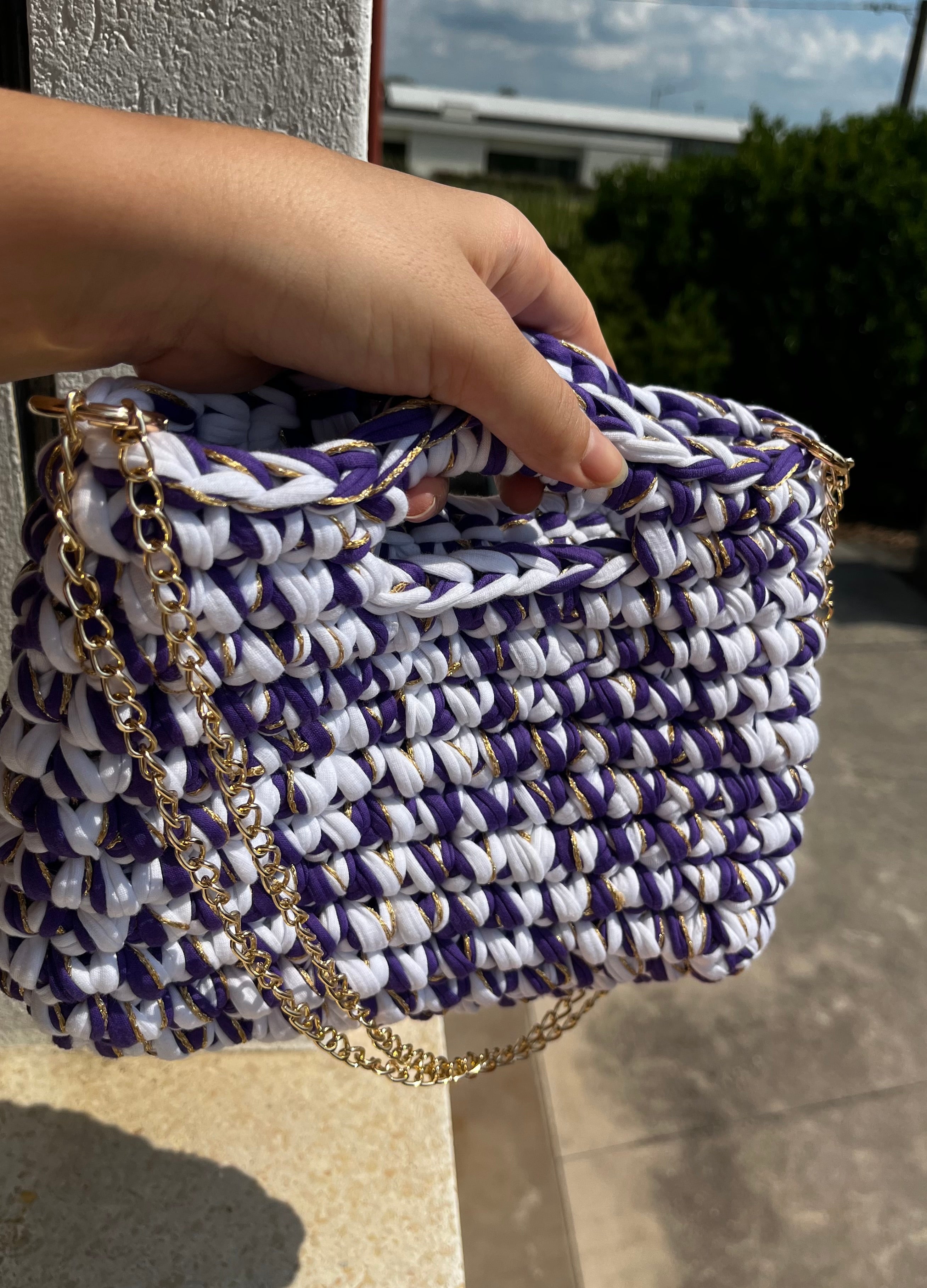 Un accessorio unico che unisce artigianato e modernità, Tote bag realizzata interamente a mano all'uncinetto con una morbida fettuccia in cotone o lycra e un filo sottile oro, è un accessorio compatto ma capiente, pensato per accompagnarti con stile in ogni occasione.